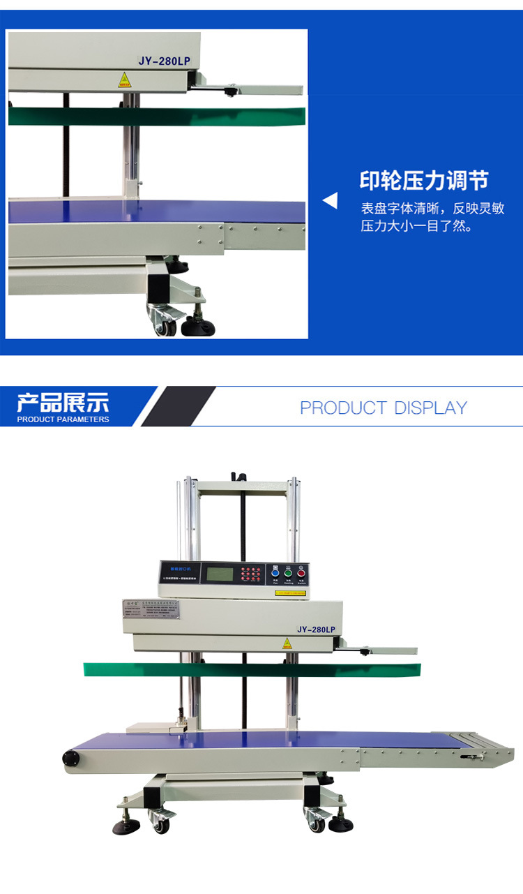 • 可升降功能:大型立式可升降連續式封口機的封口裝置具備可升降特性。這一功能主要通過電動或液壓系統來實現,能夠根據包裝材料的厚度、產品的高度以及封口位置的要求靈活調整封口高度。例如,當包裝較厚的產品或使用較厚的包裝材料時,可以升高封口裝置;反之,對于薄型包裝材料或小型產品,可以降低封口裝置,以確保封口質量和效率。