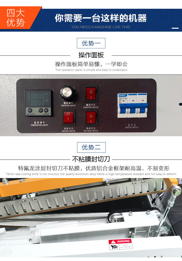- 控制系統:用于控制整個機器的運行。操作人員可以通過控制面板設置封切溫度、時間、壓力,收縮通道的溫度、風速,傳送帶的速度等參數。一些先進的控制系統還可以實現自動化編程,根據不同的產品和包裝要求,自動調整參數,并且可以記錄和存儲操作數據,方便生產管理和質量控制。