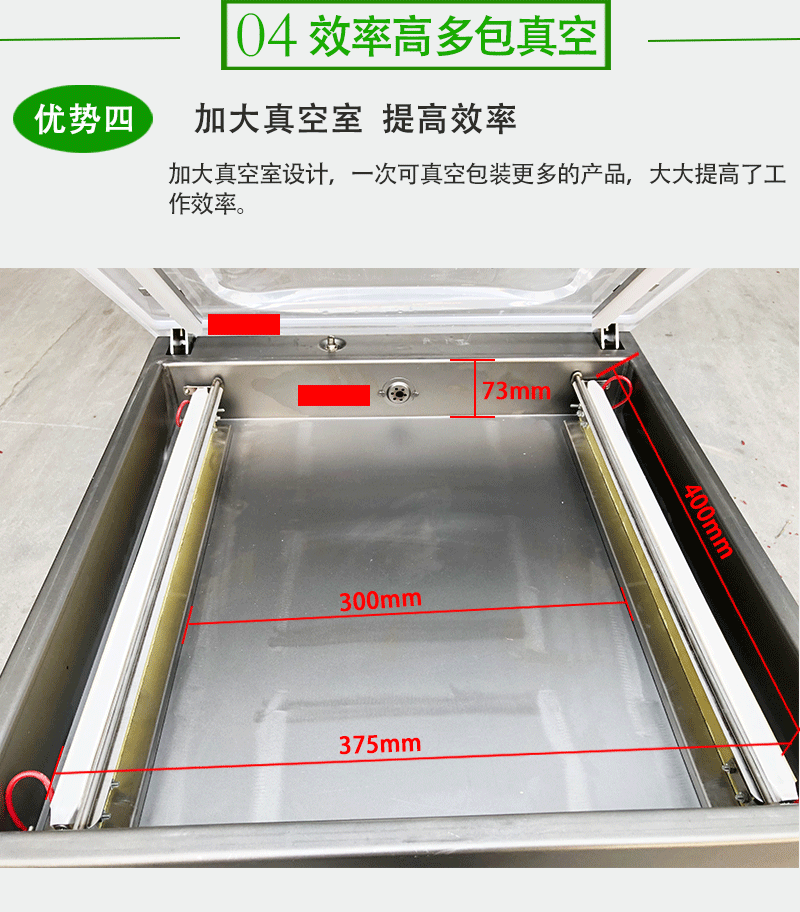- 真空室尺寸:常見的有 400×380×70mm、600×500×90mm 等。