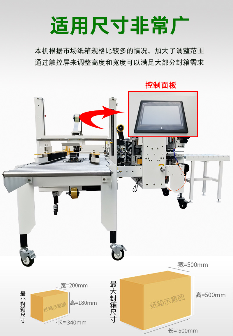 - 控制系統:一般采用 PLC 控制系統搭配操作面板,操作人員可以在面板上輕松設置輸送速度、封箱時間、加熱溫度等參數,實現精準控制。