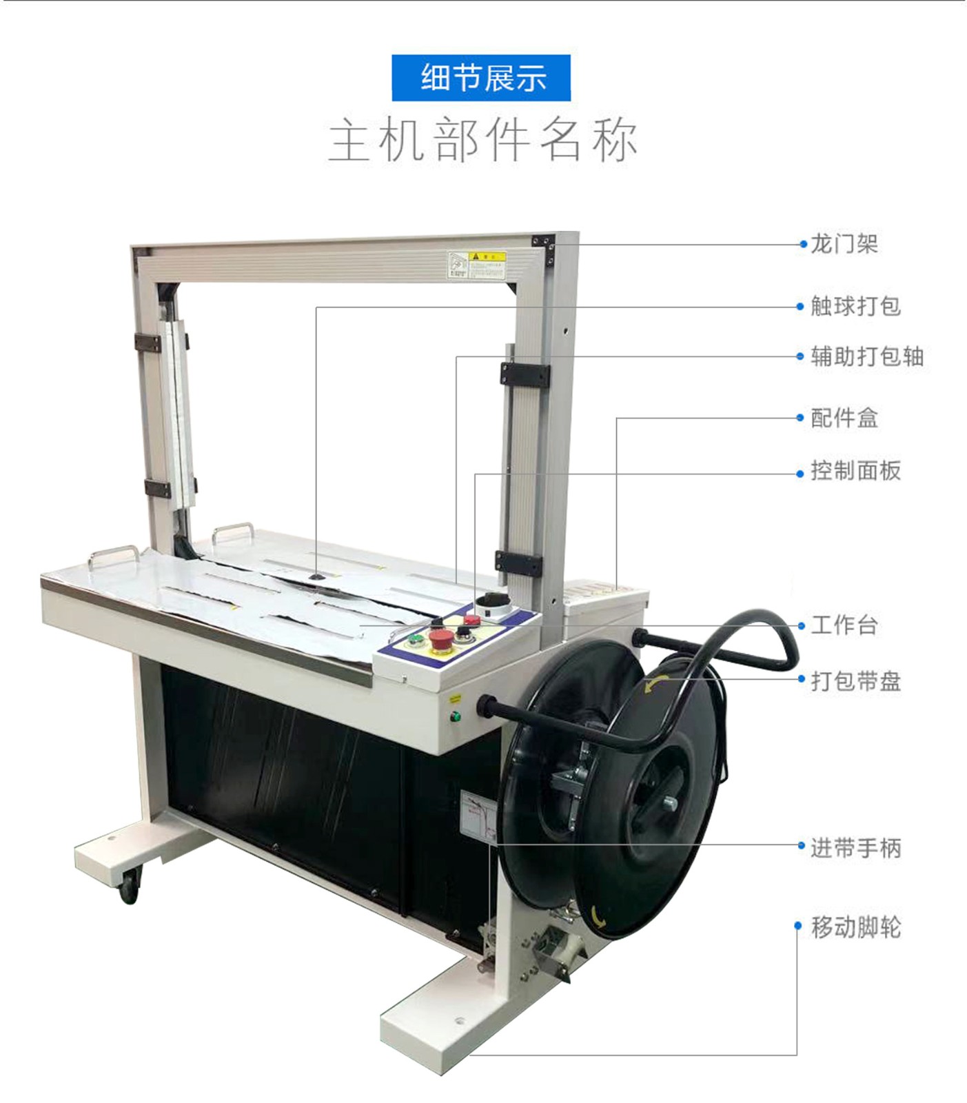 它主要由進帶機構、捆扎機構、加熱裝置、控制系統等組成。