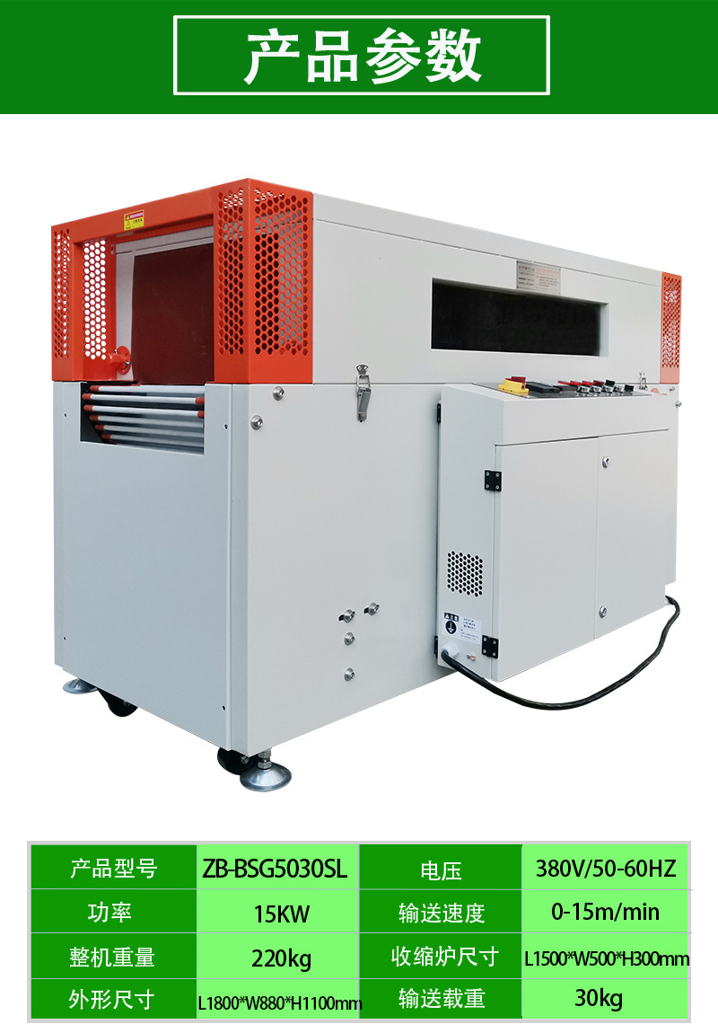 ZB-BSG5030SL熱收縮機(jī)是通過(guò)加熱裝置將熱收縮薄膜加熱至一定溫度,使其軟化并收縮,緊密地包裹在產(chǎn)品表面,從而實(shí)現(xiàn)對(duì)產(chǎn)品的包裝