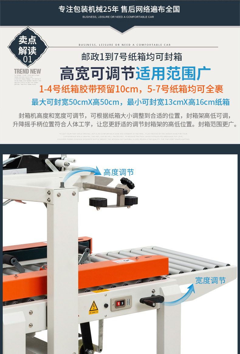 - 紙箱尺寸適應(yīng)范圍廣:自動(dòng)封箱機(jī)可以通過一些簡單的調(diào)節(jié)裝置,適應(yīng)不同尺寸的紙箱。無論是小型的快遞紙箱,還是大型的工業(yè)產(chǎn)品包裝紙箱,只要在機(jī)器規(guī)定的尺寸范圍內(nèi),都可以進(jìn)行有效的封箱。操作人員可以根據(jù)紙箱的大小,調(diào)整輸送帶的寬度、膠帶粘貼的位置等參數(shù)。