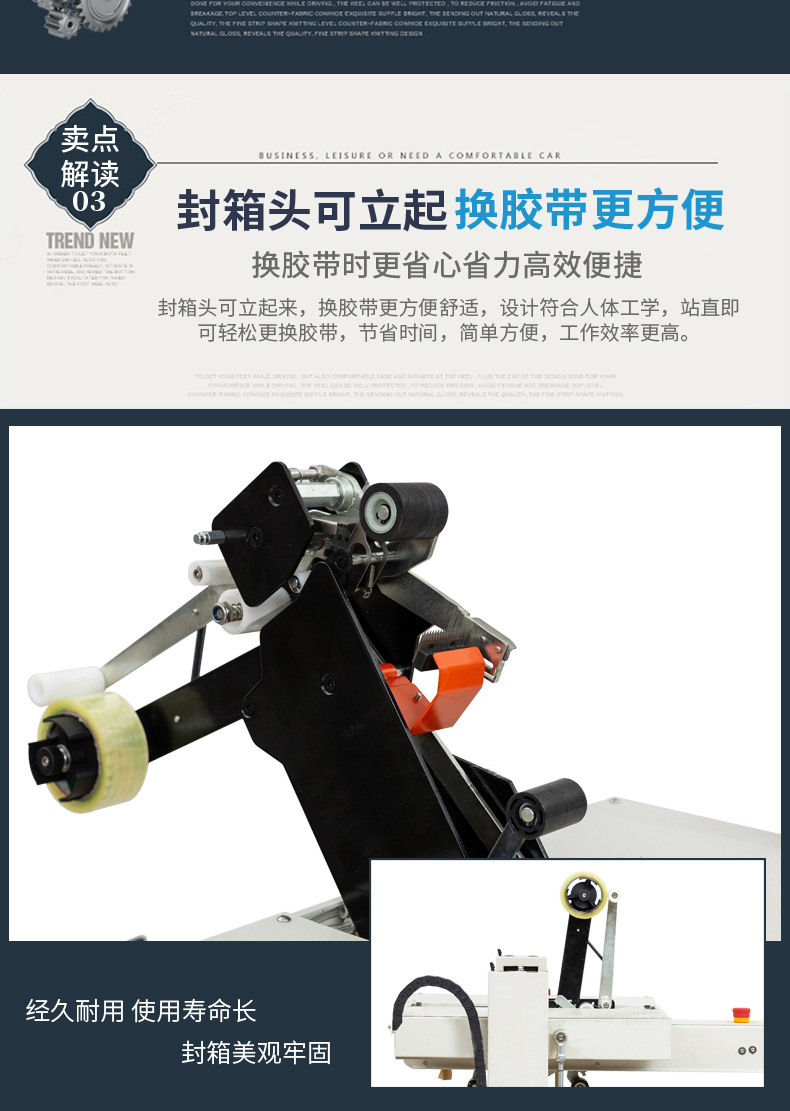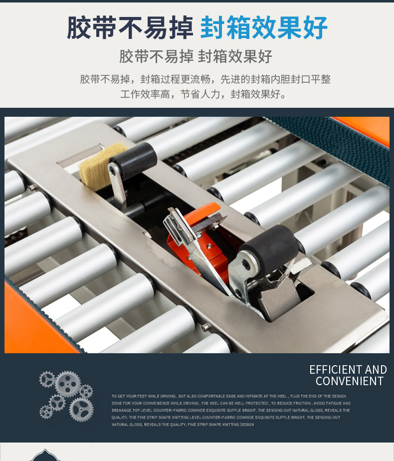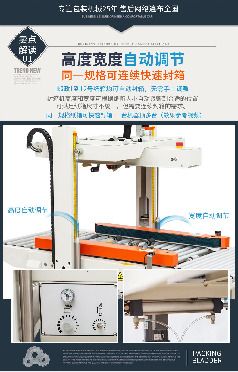 - 封箱操作:折蓋完成后,封箱機的封箱機構開始工作。如果是膠帶封箱,膠帶分配器會自動拉出一定長度的膠帶,并將其粘貼在紙箱的封口處,然后通過滾輪或壓輥等裝置將膠帶撫平,確保膠帶與紙箱表面緊密貼合,完成封箱操作。如果是膠水封箱,膠水泵會將適量的膠水涂抹在紙箱的折頁上,然后通過機械裝置將紙箱的蓋子折合,使膠水發揮粘合作用,實現封箱