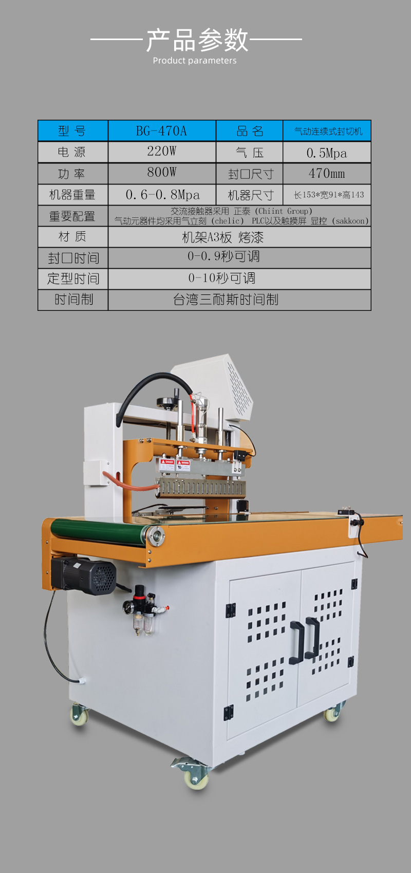 - 包裝速度:根據企業的生產規模和產量要求,計算所需的包裝速度。如果是大規模生產,每分鐘需要完成數十次甚至上百次封切動作,就需要選擇高速型的氣動連續式封切機,以確保生產效率。