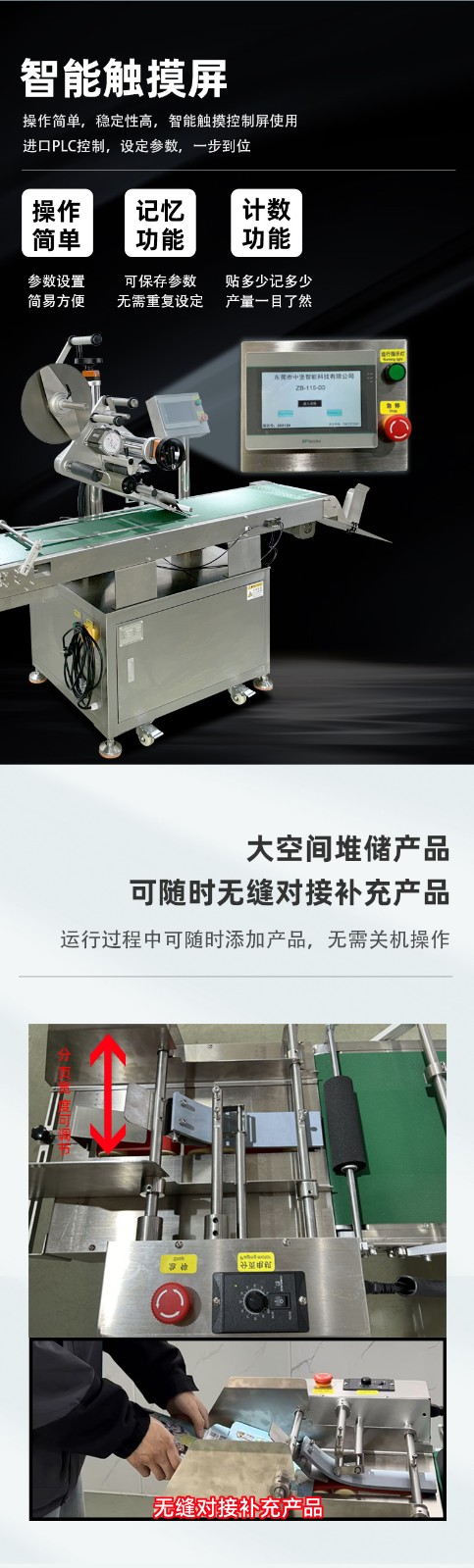 5. 控制系統原理:可編程邏輯控制器(PLC)是設備的控制核心,它根據預設的程序和參數,以及傳感器反饋的信號,對各個機構進行精確控制。例如,PLC 根據光電傳感器檢測到的標簽位置信號,控制分紙輪的轉動速度和吸嘴的吸附時間,確保標簽準確分頁;根據接近傳感器檢測到的產品位置信號,控制貼標頭的動作時機和貼標速度,保證標簽貼附位置準確。人機界面(HMI)則為操作人員提供了一個交互平臺,通過 HMI 可以方便地設置各種參數,如貼標速度、標簽間距、產品尺寸等,同時還能實時監控設備的運行狀態,如各機構的運行速度、故障報警信息等