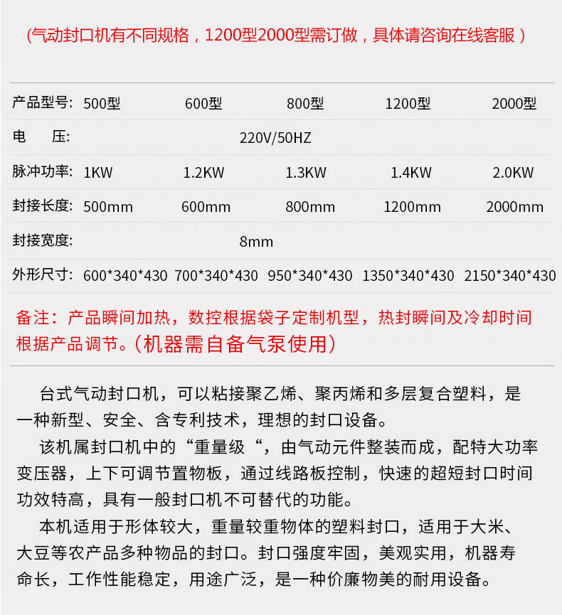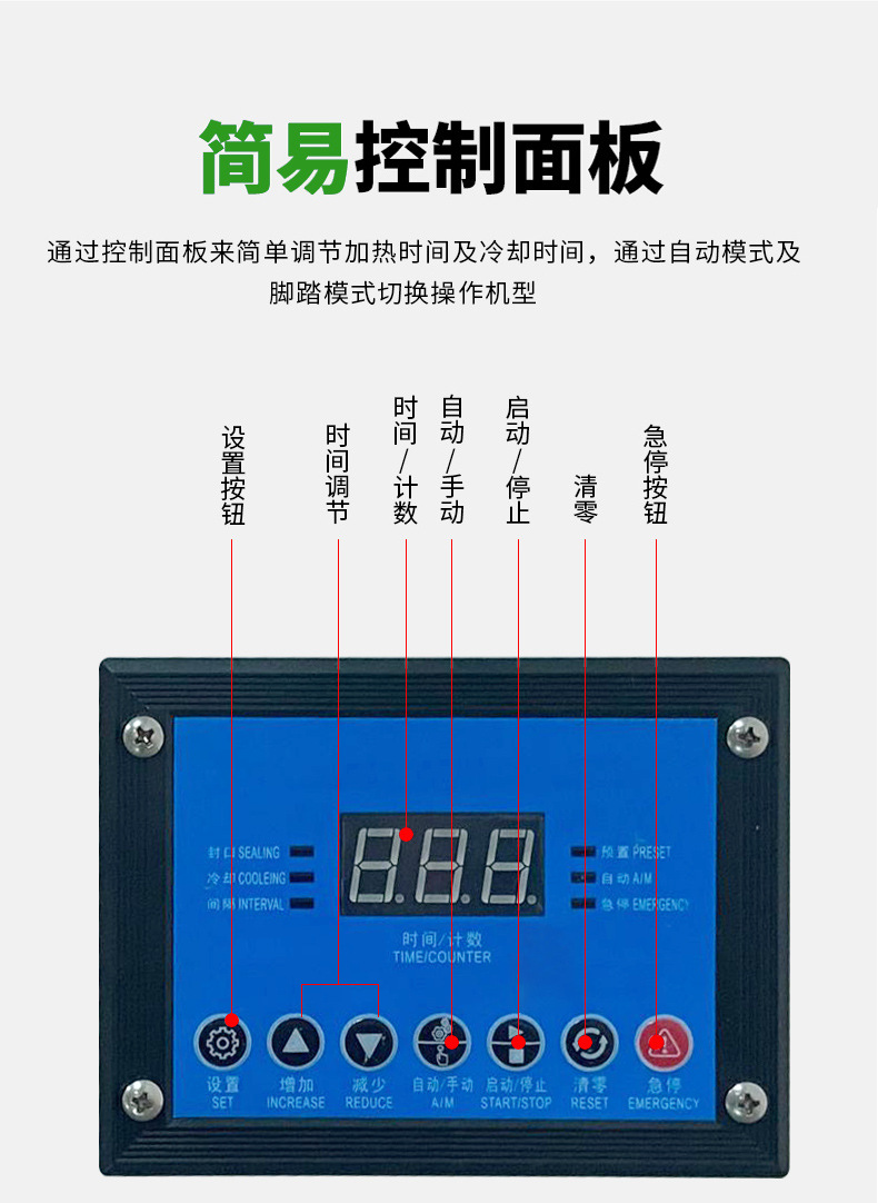 - 設(shè)備性能:優(yōu)質(zhì)的臺式氣動封口機配備高性能的氣動系統(tǒng)和加熱系統(tǒng),能夠?qū)崿F(xiàn)快速的封口動作和穩(wěn)定的溫度控制。例如,一些高端型號采用先進(jìn)的氣動元件,響應(yīng)速度快,氣缸運動平穩(wěn),可有效縮短封口周期。同時,高效的加熱系統(tǒng)能在短時間內(nèi)達(dá)到并保持合適的封口溫度,提高每次封口的效率。