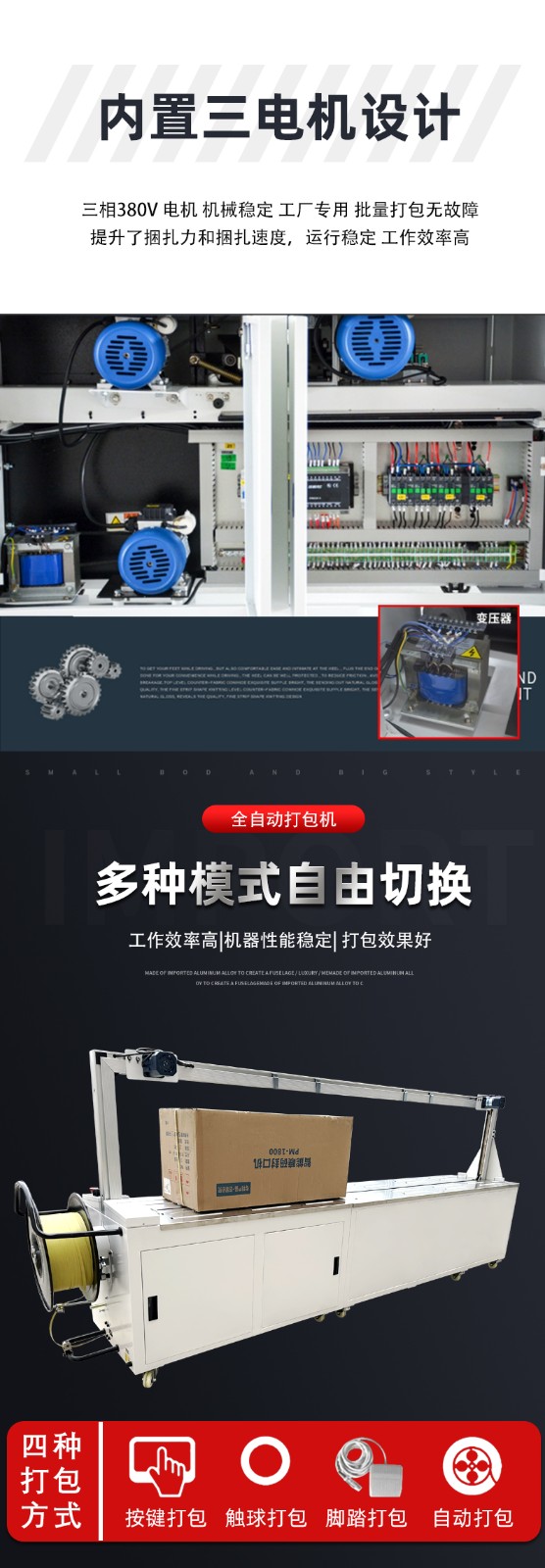 - 全自動打包機:工作效率高,由于無需人工頻繁操作,連續打包能力強,每分鐘可完成多個物品的打包,適用于大規模、高頻率的打包作業,如大型物流中心、生產車間等。