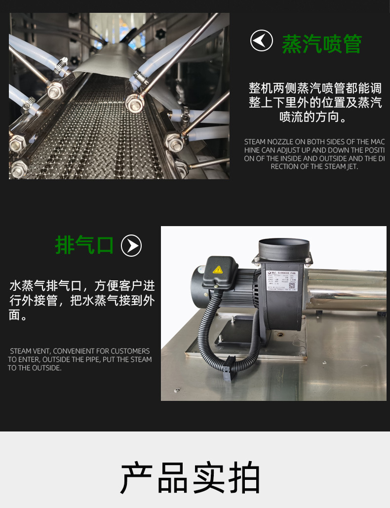 蒸汽式熱收縮機瓶身﹑瓶底以及整體。適用于食品、藥品、化妝品、農藥等行業的玻璃瓶、塑料瓶、紙杯等容器的標簽收縮。先人工套上標簽膜,放進自動蒸汽收縮機進行收縮包裝,最后流水線出產品。