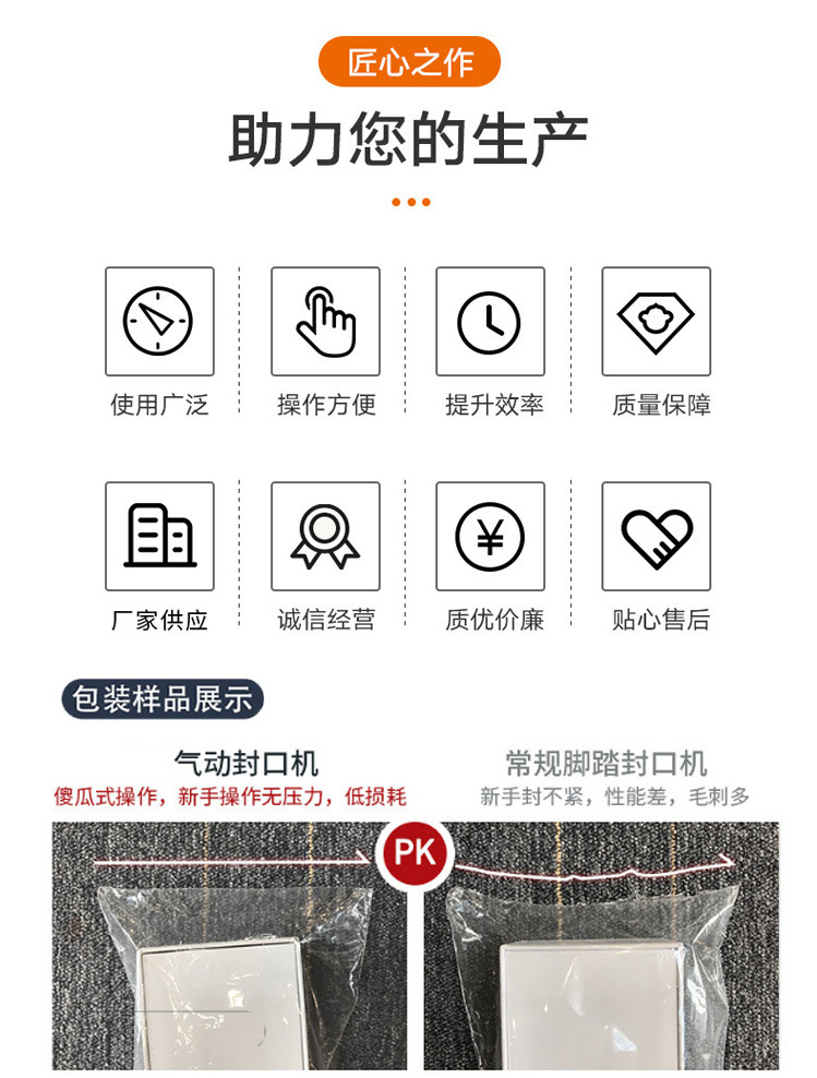 機器采用的是不銹鋼材料制成,利用壓縮空氣作為動力,封口的壓力可以進行調(diào)試,根據(jù)產(chǎn)品的不同選擇合適的壓力指數(shù)。設備穩(wěn)定可靠,可以手動操作也可以腳踏操作,簡單方便。