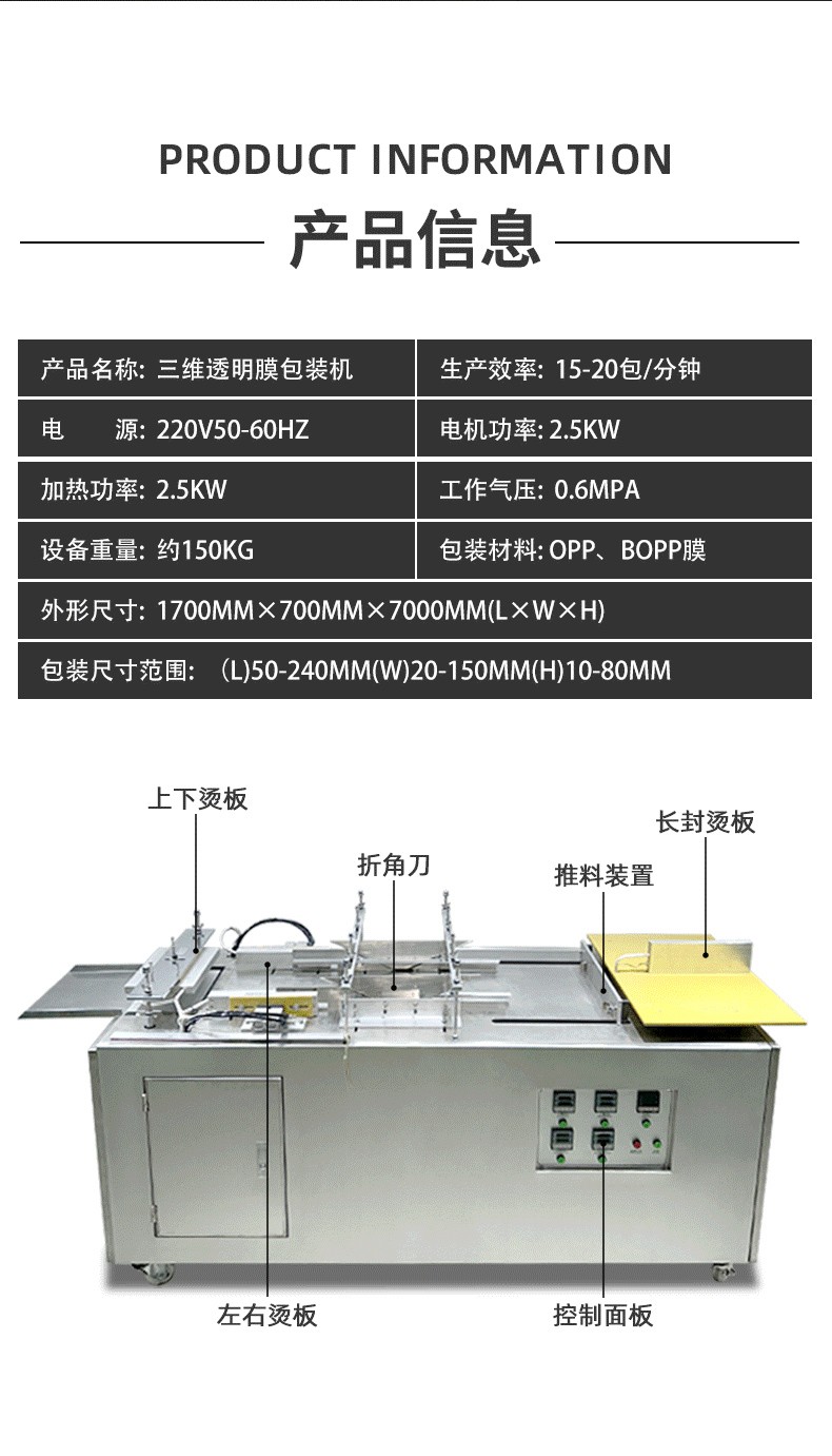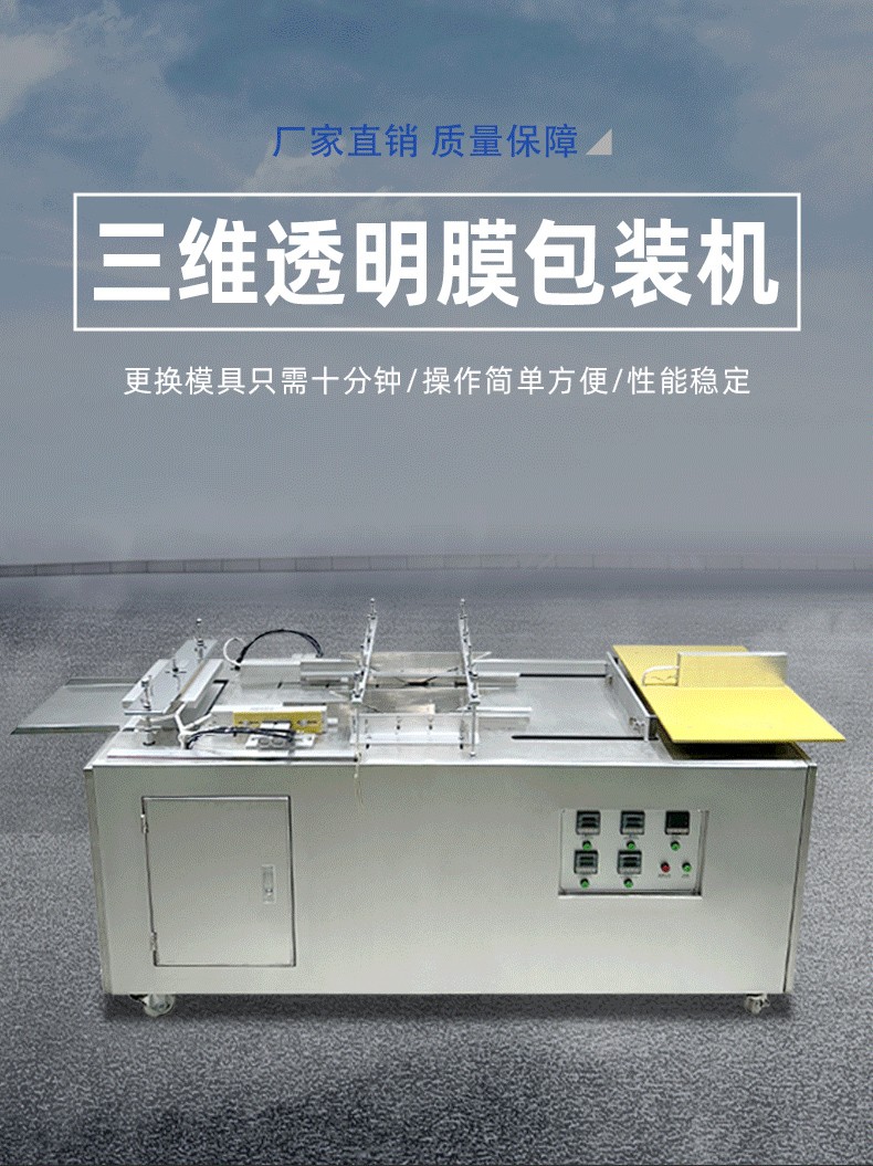 設(shè)備通過(guò) “膜料預(yù)處理→人工上料定位→三維裹膜成型→熱封切邊→折邊定型→成品輸出” 的流程,實(shí)現(xiàn)產(chǎn)品的立體包裝,具體步驟拆解如下: