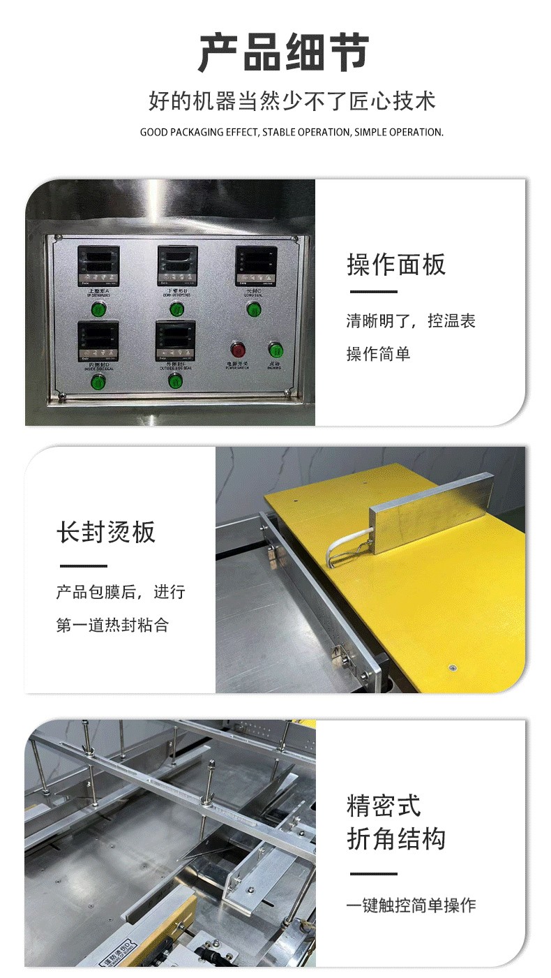 - 折邊定型:封切后的產(chǎn)品進(jìn)入折邊工位,預(yù)熱裝置先對(duì)產(chǎn)品兩端的多余膜料進(jìn)行軟化(便于塑形),再通過(guò)機(jī)械折邊機(jī)構(gòu)(側(cè)折板、端折板)將膜料折疊、壓合,使包裝邊緣平整緊致,最終形成與產(chǎn)品形狀完全匹配的立體包裝;